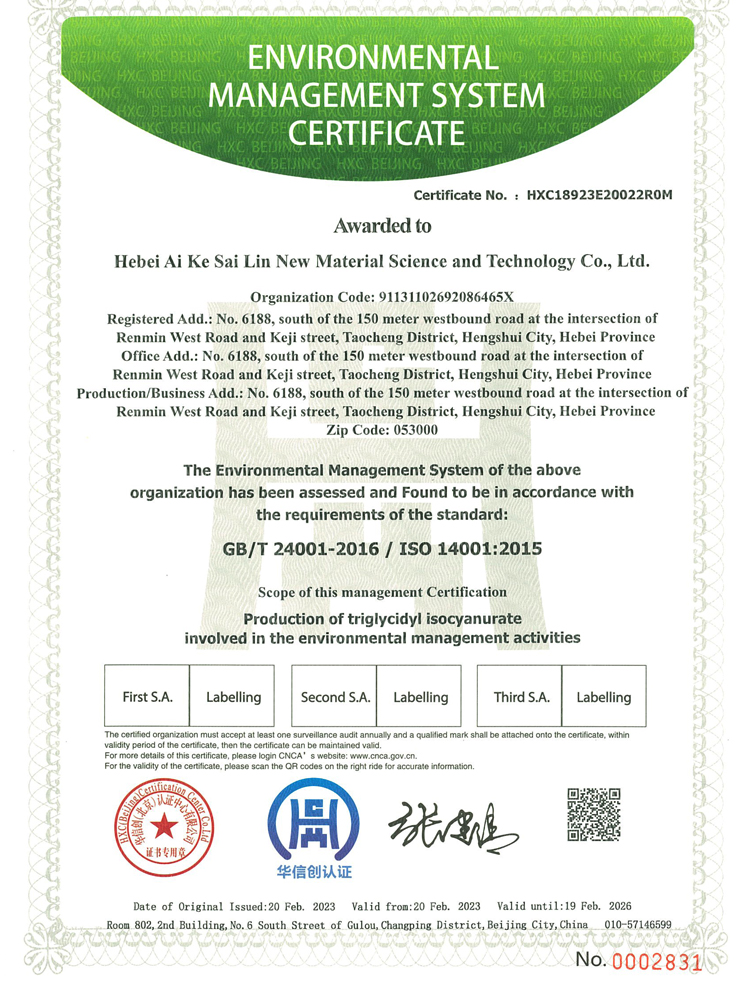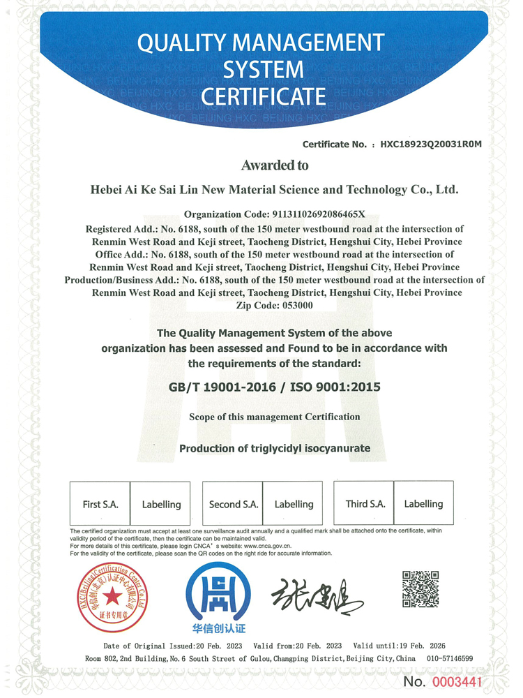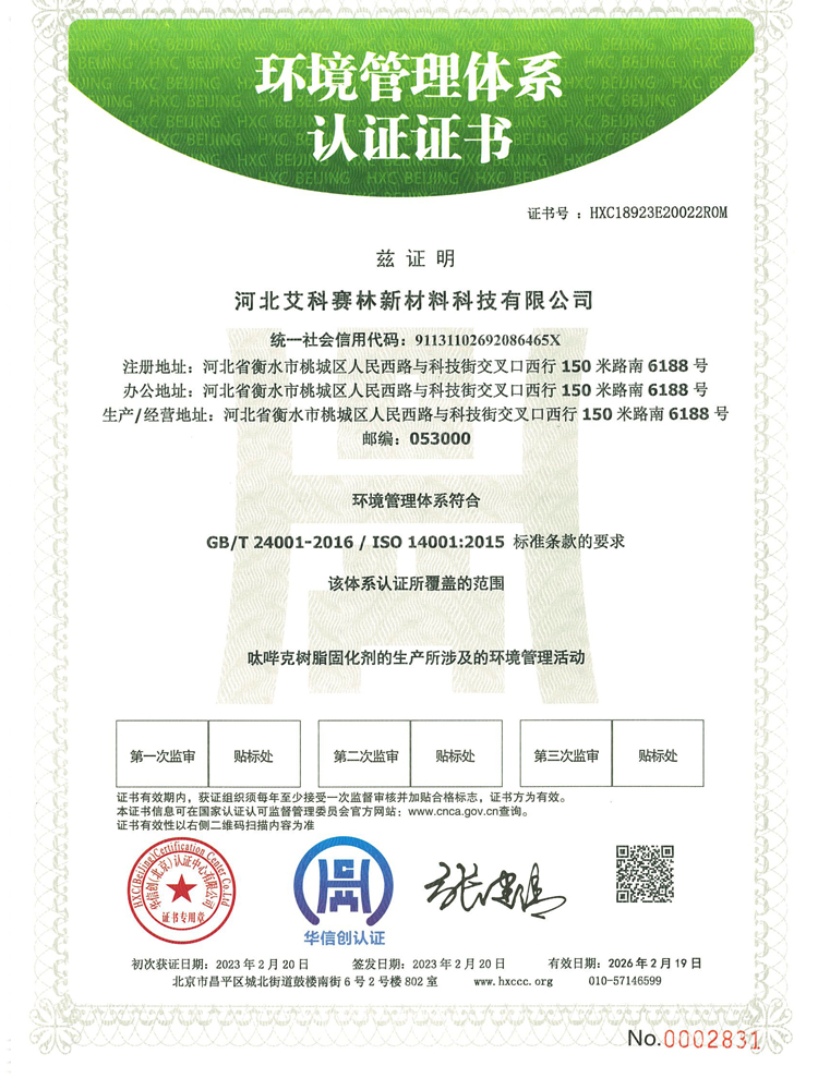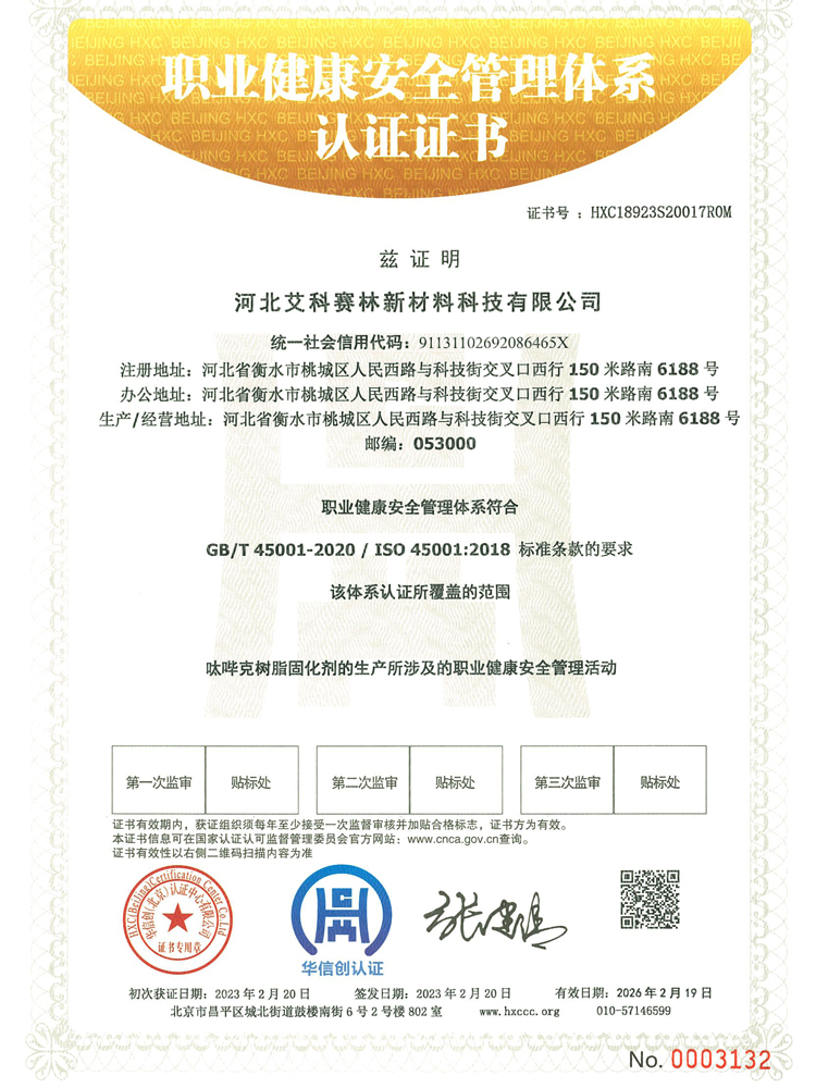 河北艾科賽林新材料科技有限公司成立于2009年,坐落在河北衡水桃城省級(jí)高新技術(shù)產(chǎn)業(yè)園區(qū),占地100畝,注冊(cè)資金2500萬(wàn)元,是一家以粉末涂料固化劑及高性能特種材料研發(fā)、生產(chǎn)、銷(xiāo)售為一體的高新技術(shù)企業(yè)。在激烈的市場(chǎng)競(jìng)爭(zhēng)中不斷壯大,產(chǎn)品憑借良好的信譽(yù)與精益求精的工藝,在市場(chǎng)中取得良譽(yù)和好評(píng)。公司已通過(guò)ISO9001質(zhì)量管理體系,IS014001環(huán)境管理體系、ISO45001職業(yè)健康安全管理體系。公司被認(rèn)定為“高新技術(shù)企業(yè)”,河北省“專(zhuān)精特新”中小企業(yè),先后獲得河北省行業(yè)“技術(shù)創(chuàng)新先進(jìn)企業(yè)”,桃城“校企合作創(chuàng)新優(yōu)秀企業(yè)”、畝均“納稅貢獻(xiàn)先進(jìn)企業(yè)”等榮譽(yù)稱(chēng)號(hào)......
